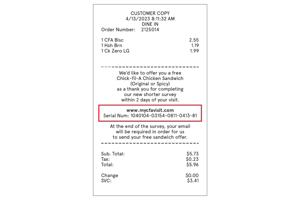 - Receipt: If the survey is available, you can find the serial number or Survey ID Code printed at the bottom of your receipt. Visit the My CFA Visit page to take the survey. Note: Not every receipt includes an invitation to take the survey.