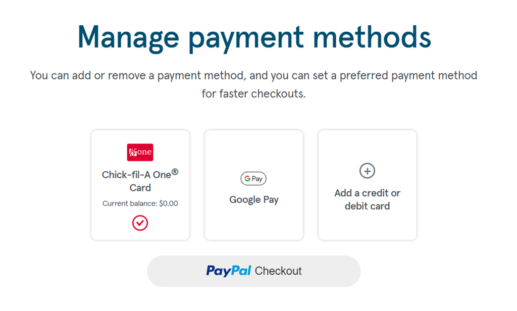 - If checking online, sign in to your Chick-fil-A One Account, click on Account in the top right corner of the screen, select Payments and Subscriptions, and then Manage payment methods. Your current Chick-fil-A One Digital Gift Card balance will be displayed.
