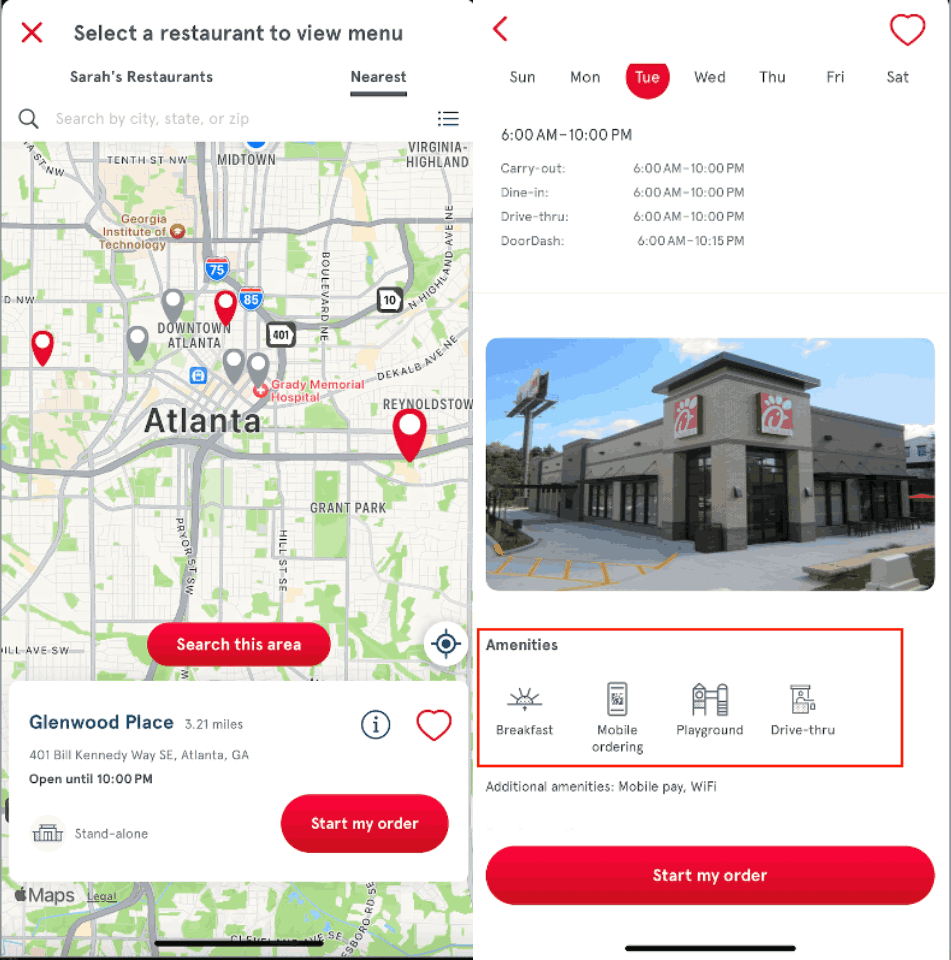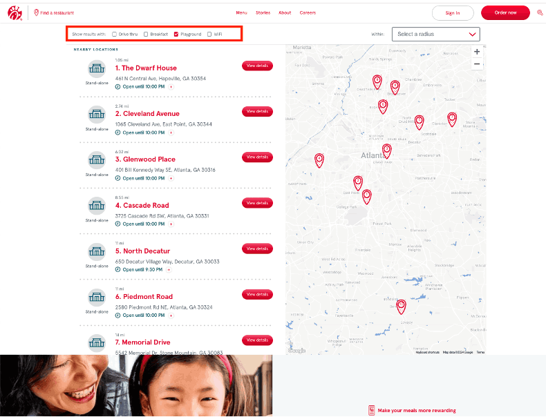 - Click into each location in the Map View and select the information icon to see a list of amenities. Playground will be listed if the selected restaurant has a playground.