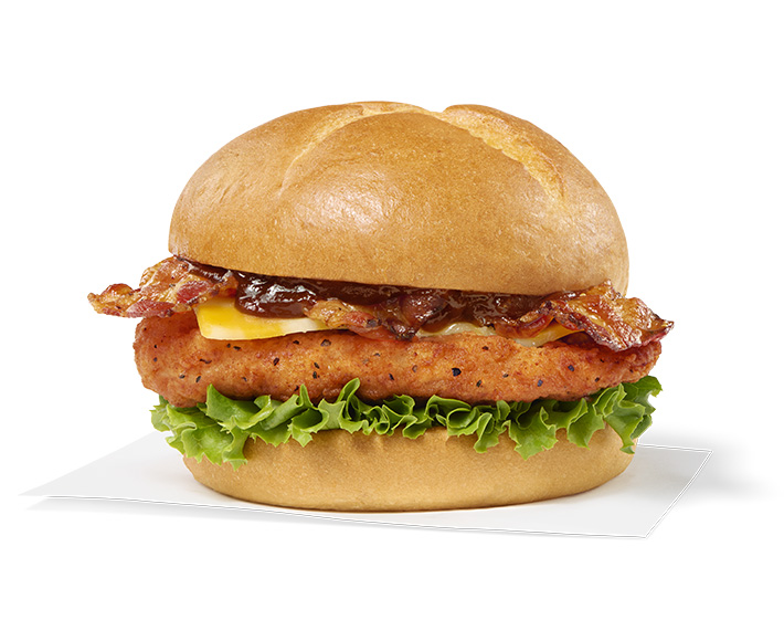 Una pechuga de pollo deshuesada y sazonada al punto con una picante mezcla de chiles, recién empanizada, cocinada a presión en aceite de maní 100% refinado y servida en un pan tostado con sabor a mantequilla, queso Colby-Jack, bacon con azúcar morena y pimienta, y lechuga. Sale con salsa Smokehouse BBQ.