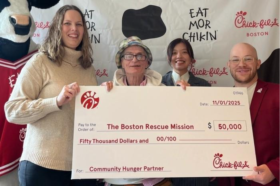 At Chick-fil-A Copley Square’s reopening, its Chick-fil-A Shared Table® program partner Boston Rescue Mission was awarded a $50,000 grant in honor of its work to support people experiencing homelessness. Representatives from the organization were invited to the grand reopening, where they were surprised with the donation.