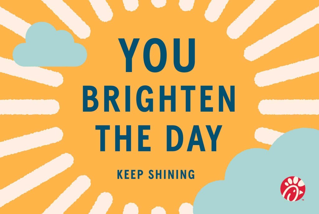 Chick-fil-A Team Members always strive to deliver service with a smile, but one Team Member took it a step further when she began writing little notes of encouragement on customers’ cups and bags. This small act inspired one customer to spread kindness to others in her own life. And, in turn, it inspired others to do the same. So began Sunshine Days, a week-long celebration of the little acts of kindness all of us can do to make others feel valued.